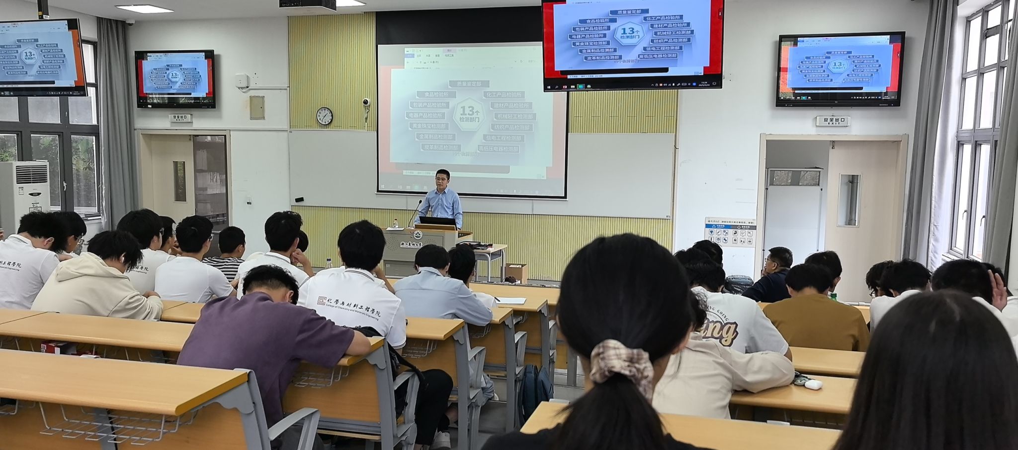近日,刚刚受聘成为企业家班主任的杭州市化工研究院副院长田清泉、浙江方圆检测集团股份有限公司食品检测研究所所长刘鹏鹏,分别走进了BEAT365英国官网应用化学专业2024级1班、2班,与同学们就职业规划、实习实践进行座谈,并围绕检测标准国际化、产学研协同创新、职业核心竞争力构建等问题展开深入交流。