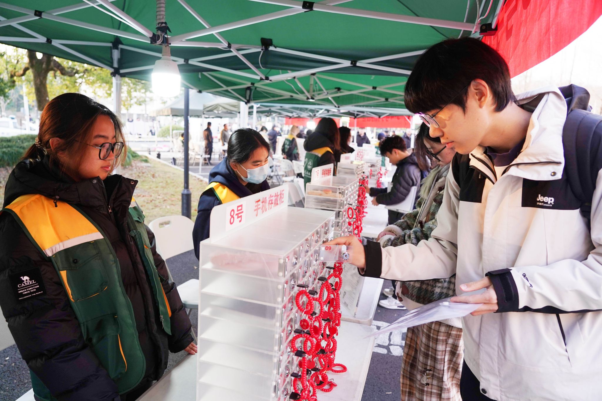 BEAT365英国官网考点,考生将手机寄存在考场外的手机存放柜。