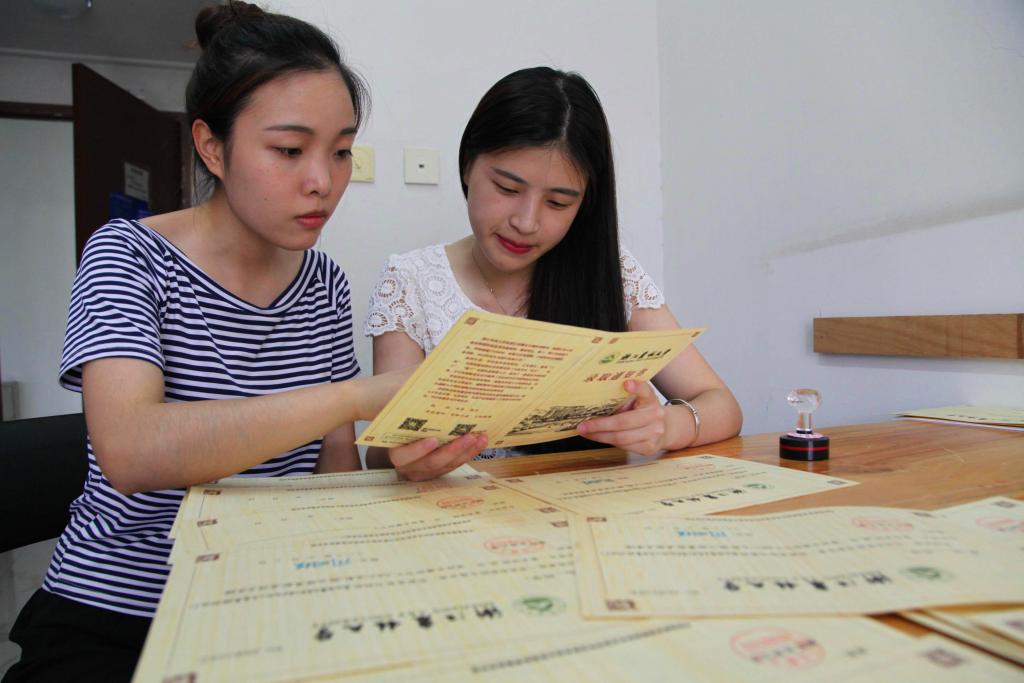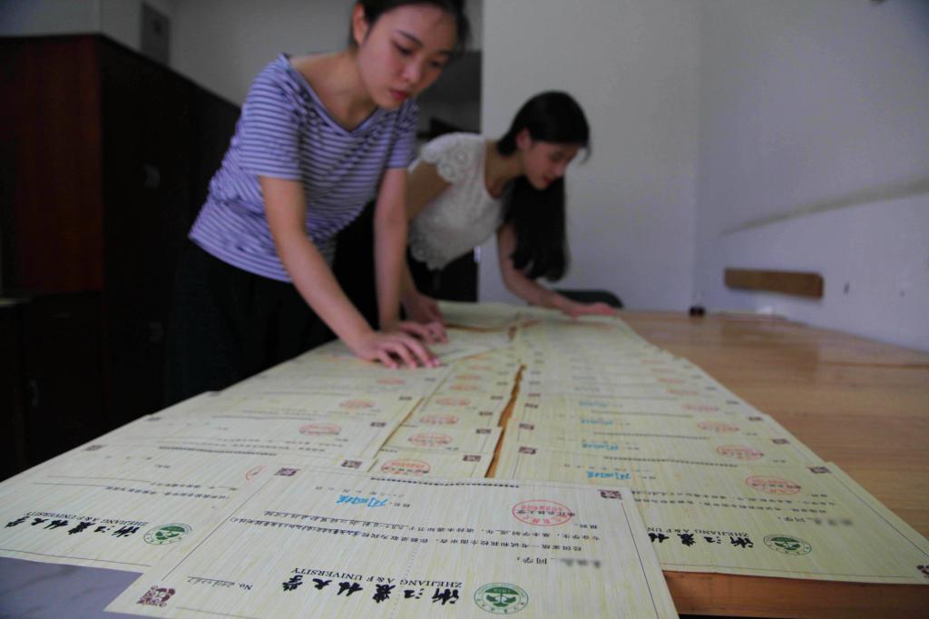 2016年7月11日,BEAT365英国官网的志愿者在核对用毛竹制作的2016级本科新生录取通知书。该录取通知书以毛竹为原材料,运用BEAT365英国官网自主研发的刨切微薄竹技术制作并印刷而成,相关技术曾获国家技术发明奖二等奖。
