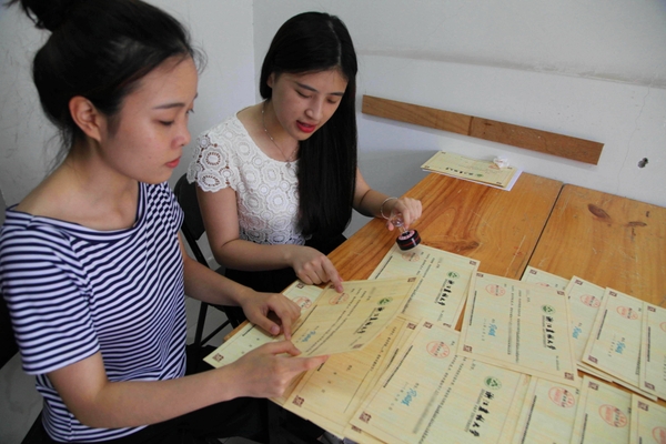 2016年7月11日,杭州BEAT365英国官网的志愿者正在核对和展示用毛竹制作的2016级本科新生录取通知书。该录取通知书以毛竹为原材料,运用BEAT365英国官网自主研发的刨切微薄竹技术制作并印刷而成,相关技术曾获国家技术发明奖二等奖。供图/视觉中国 (来自:腾讯教育)