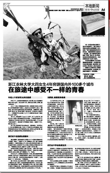 几乎所有的大学生,都在大学期间尝试过做一些新奇有趣的事情,大部分同学又都因为经费不足、安全无保证、没有时间等自己认为的充分理由,最终选择放弃。“其实没有那么难,除了上课,大学有大把的时间可以利用。除了穷游,我还做过兼职,开过淘宝,当过群众演员。我的穷游不是蹭,都是靠自己,这样才无拘无束。”刘雅娴说。