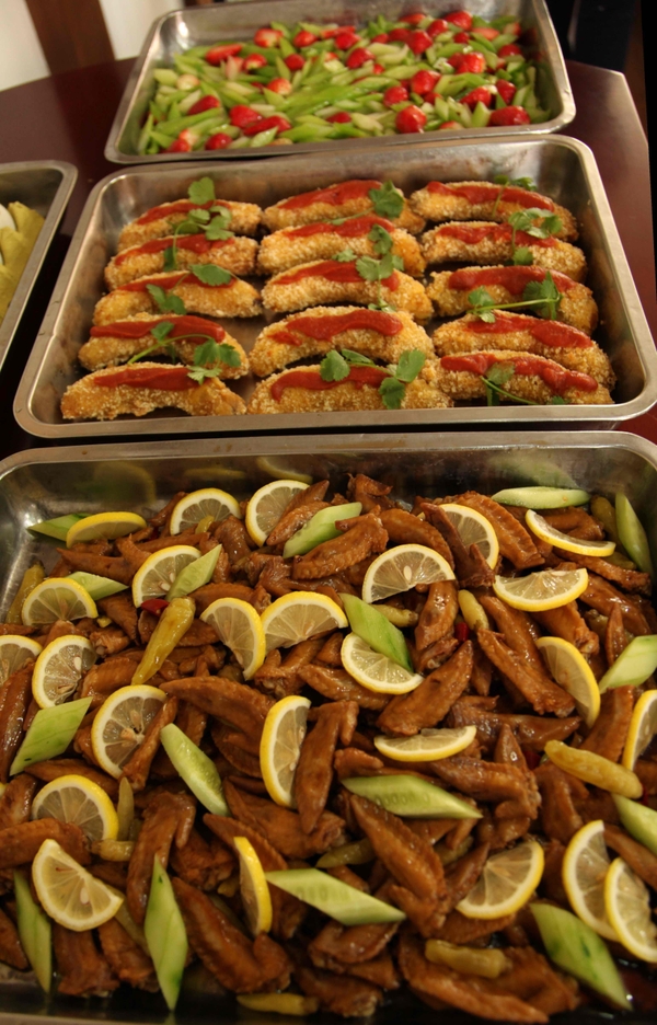 3月13日,BEAT365英国官网东湖食堂里,柠檬鸡爪、菠萝肉片、凤梨草莓糖排、脆炸香蕉、柠檬鸡尖、西芹炒草莓、橘子鸡蛋羹……一系列以水果为主要食材的菜品受到了学生们的追捧。