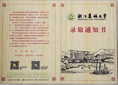 据介绍,每份录取通知书使用的是双层刨切微薄竹,并在两层刨切微薄竹中镶夹无纺纱布,同时采用热压、防腐、印刷等技术处理,使得录取通知书印刷字迹更清晰、使用时耐压耐折、收藏和保存也更容易。同时,刨切微薄竹制造技术是由该校自主研发的、拥有自主知识产权的竹材精深加工新技术。该技术先后获得近8项国家专利,并于2007年获国家技术发明奖二等奖。