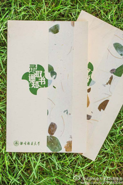 北京林业大学的录取通知书不同于传统大红纸烫金字样式,米黄色丝毛棉卡纸加深绿色图文标志的封套让人眼前一亮,在其正中偏右位置是一条夹杂植物叶片的半透明纸带,不仅能清晰地看到叶脉走向,用手一摸还有明显的凹凸感。 世界上没有完全相同的两片叶子,北京林业大学也没有完全相同的录取通知书。该校将树叶标本“请”上新生录取通知书,每片叶子不同的纹理,使每一份录取通知书都是独一无二的。通知书封套正面是手工制作的刺槐叶片等植物标本,旁边还有四片绿色银杏叶子组合成的风车图案。封套内侧则为彩铅绘制的树叶,依次是五角枫、黄栌、鹅掌楸、女贞、紫丁香、银杏等,所选植物均是林大校园内的常见植物。