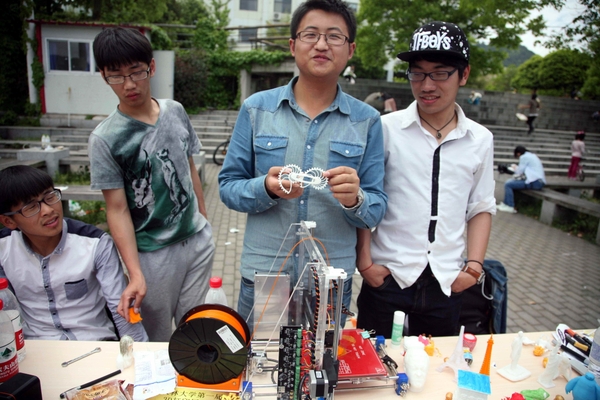 图为温春雨(右二)和团队成员在校园里用他们组装的3D打印机,为同学们打印各种树脂模型。