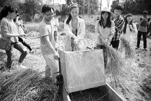 听了老师和同学的指点,从来没有干过农活的城里姑娘周旭云也麻利地割起了水稻,并学会了怎样使用打稻机,如何轻松地打下稻谷。周旭云说:“‘锄禾日当午’谁都会背,但是现在的大学生不只没有亲身参与秋收,甚至很多人连看都没看过。”虽然她的手臂被稻草割了条口子,但是看着打下来的一堆谷子,周旭云“比考试考了满分还高兴”。