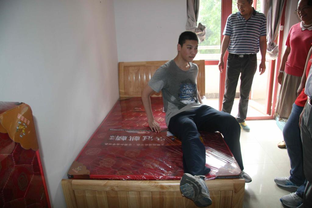 抚摸着这专门为自己购买的新床,1.98米的徐仡哲迫不及待地坐上了新床,试了试床的长度和大小:“这张床我非常喜欢,谢谢学校的关心,这下子再也不用担心睡不踏实了。”
