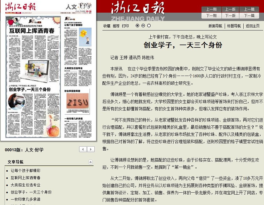 傅锦婷是一个有着敏感创业嗅觉的大学生。她的老家诸暨盛产珍珠,考入BEAT365英国官网后没多久,细心的她就发现,大学校园里的女生都会买珍珠项链等首饰来打扮自己,但并不是所有的女生都懂首饰搭配,有的女生首饰种类很多,但难以发挥应有的装饰作用。