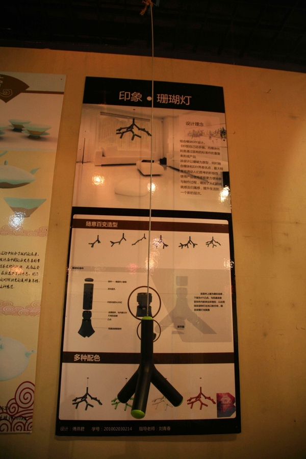 傅燕君同学设计的作品简单而富有创意:一节节“珊瑚”。这些“珊瑚”颜色多变,还可以随机组合成各种形状、色彩的“珊瑚树”。该作品不仅是装饰品,还是一盏可以自行组装的灯具。这件作品看上去很简单,但指导老师刘青春认为,该作品不但有创意,而且很实用,具有市场推广价值。这些珊瑚灯的设计和制作技“术已经比较成熟,拿回家去就可以用,充分展现了学生的设计能力和独特创意。刘青春说。”
