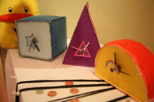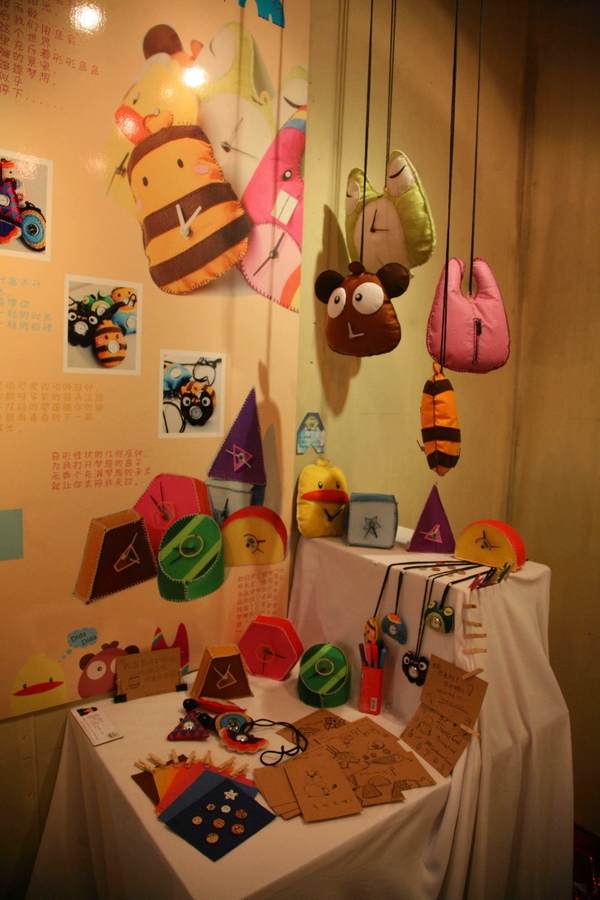 在学生设计的近百套作品中,一系列具有钟表功能的毛绒玩具、小包包以及小摆件,经过创意设计成为“创意时钟”特别引人关注。这些创意时钟,, 是应届毕业生朱夕夕充分结合毛绒玩具、小包包以及小摆件特点设计的,时钟设计的位置恰到好处,不仅未影响物品本身的欣赏价值和使用价值,而且赋予了这些物件新的使用功能和艺术美感。正在欣赏“创意时钟”的大一学生周泽亮觉得:太漂亮了,“ 这些作品如果可以卖就好了,我一定立即买一个。”