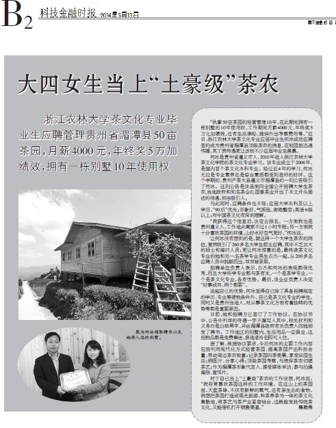 “执掌50亩茶园的经营管理10年,在此期间拥有一栋别墅的10年使用权,工作期间月薪4000元、年终奖5万元加绩效,还有生活津贴、提供外出考察费用等。近”日,BEAT365英国官网茶文化专业应届毕业生何冰成功应聘签约成为贵州省湄潭县顶级茶农的消息,在校园里迅速传播,其工资待遇更让该校不少应届毕业生羡慕。