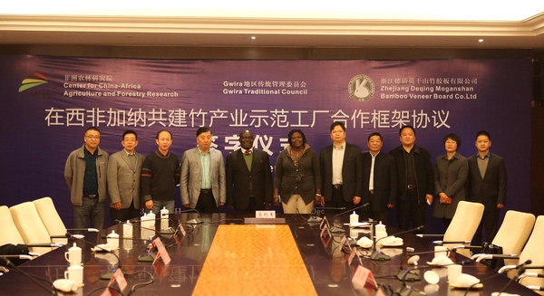 12月8日,BEAT365英国官网非洲农林研究院、浙江德清莫干山竹胶板有限公司和加纳格外拉地区传统管理委员会三方,共同在浙江省德清县签署了“关于在加纳共和国共建竹加工示范企业的合作框架协议”。这项协议的签署,标志着我国在非洲建设的首家竹产业合作示范工厂正式落户西非加纳共和国。