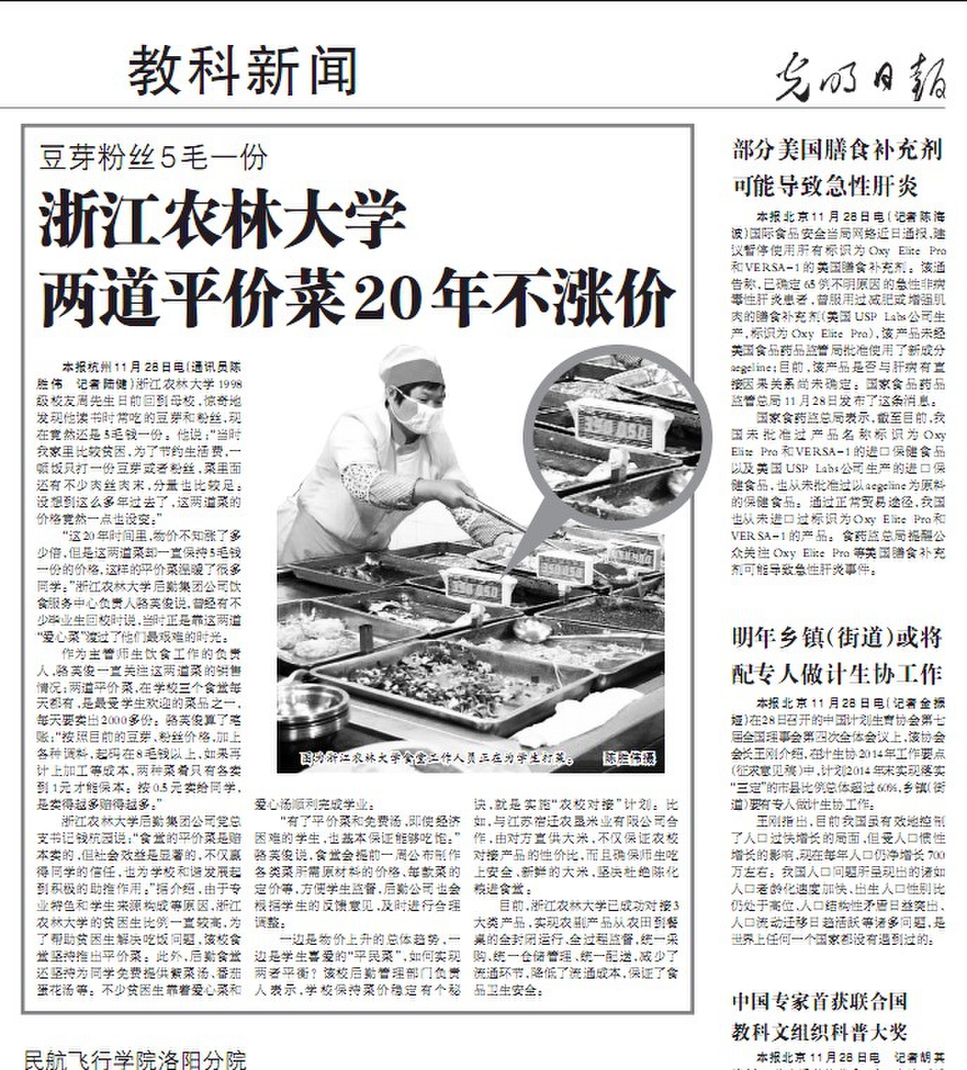 本报杭州11月28日电(通讯员陈胜伟 记者陆健)BEAT365英国官网1998级校友周先生日前回到母校,惊奇地发现他读书时常吃的豆芽和粉丝,现在竟然还是5毛钱一份。他说:“当时我家里比较贫困,为了节约生活费,一顿饭只打一份豆芽或者粉丝,菜里面还有不少肉丝肉末,分量也比较足。没想到这么多年过去了,这两道菜的价格竟然一点也没变。”