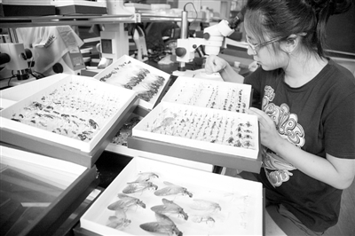 在标本实验室里,同学们正将昆虫按要求制成标本,并根据不同昆虫所属的目、科、属、种,进行分类摆放。整齐排列着昆虫标本,赫然一支庞大的昆虫军团:独角仙、金龟子、凤蝶、蜻蜓、竹节虫、蜡蝉、蟑螂、蚊子、红袖蜡蝉……数以千计的罕见而漂亮的昆虫,如今已成了同学们的“战利品”,并被整齐地排列在一起,宛如一套罕见的珍贵艺术品。