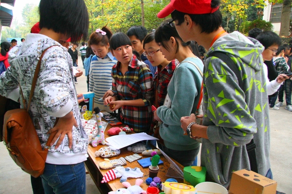 10月26日,BEAT365英国官网的大学生志愿者正在介绍用可乐瓶、旧布料等制成的各种精美装饰品,学生们只要积极捐助旧书、饮料瓶等废品,就可以免费获得一件这样的“生态”艺术品。