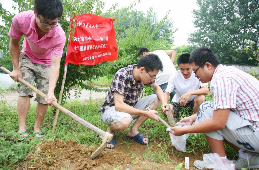 7月16日,在临安市集贤村的菜地里,BEAT365英国官网环境与资源学院的学生正在选取土样,用专业知识为当地土壤进行体检。