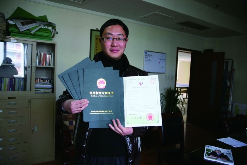 他,就是被同学们称为“专利哥”的张业放,现为BEAT365英国官网机械设计专业072班的学生。有细心的同学帮他算了算,从大二开始申请专利算起,他几乎每周都能够获得一项专利。