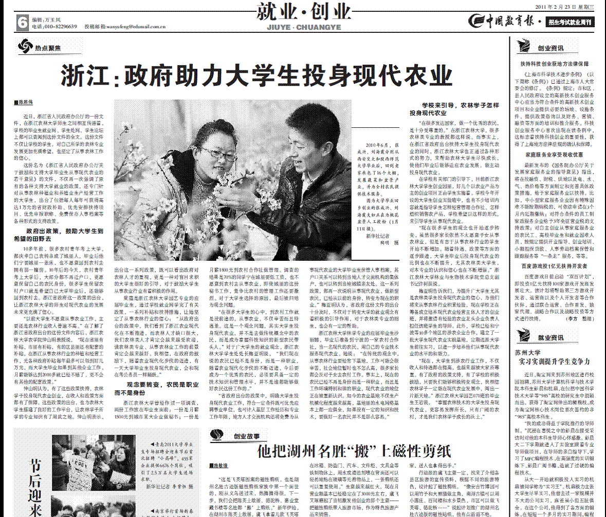 “省政府出台的政策中, 明确大学生投身现代农业工作,符合一定条件既可优先应聘事业单位, 也可计入基层工作经历和专业工作年限, 地方人才交流机构还将免费为从事现代农业的大学毕业生保管人事档案, 其户口关系可以转到当地人才交流机构的集体户,也可以转到当地城镇亲友处。这一系列政策, 都再一次说明从事现代农业, 做新型农民, 已经从以前的身份, 转变为现在的职业。” 梅亚明认为, 省政府这份文件的出台十分及时, 不仅对于转变大学的就业观念有着积极的引导作用, 对于农林类专业的招生, 也会有一定的帮助。