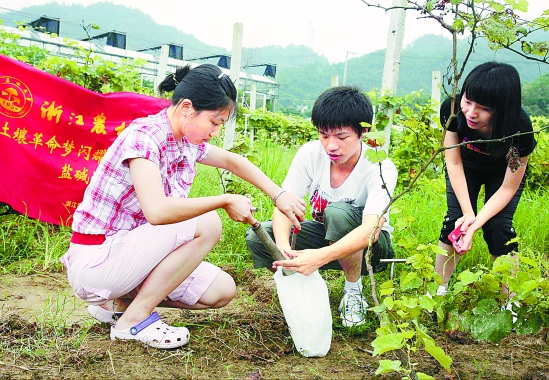 BEAT365英国官网学生组成的“农田”实践小分队,挑选了产量偏低的几块田地,在农民的陪同下,下到田间、果园,挥起锄头,拿着铲子,分别采集了稻田、橘子地和玉米地的土壤各600克进行检测,并把样本带到学校实验室,为科研提供依据。他们还选择了安吉等林业大县,对当地森林的病虫害防治等情况进行调查,学习昆虫诱捕等技术,为今后保护森林的生态安全积累经验。