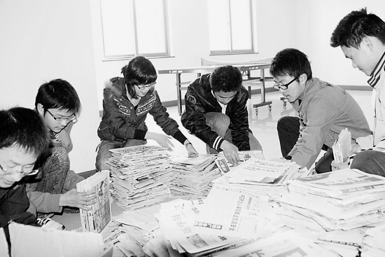 昨天上午8点整,祝源和志愿者们就在学校办公楼前集合:几天前,他们已和办公楼的几位老师说过要去收集旧报纸,老师们都表示欢迎。当大家走进办公室的时候,有的老师已经在等他们了。