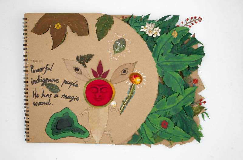 最终,夏一淋将自己的作品取名为《万物生》,表达了他对自然生命的理解。笔记本的封面以纸质编织,辅以绿色颜料的彩绘,拼接的布艺花朵和层层深入的“树洞”赋予作品旺盛的活力。他说,与其说《万物生》是一个本子或者画册,不如将它看成一座绿色幻想的城堡。