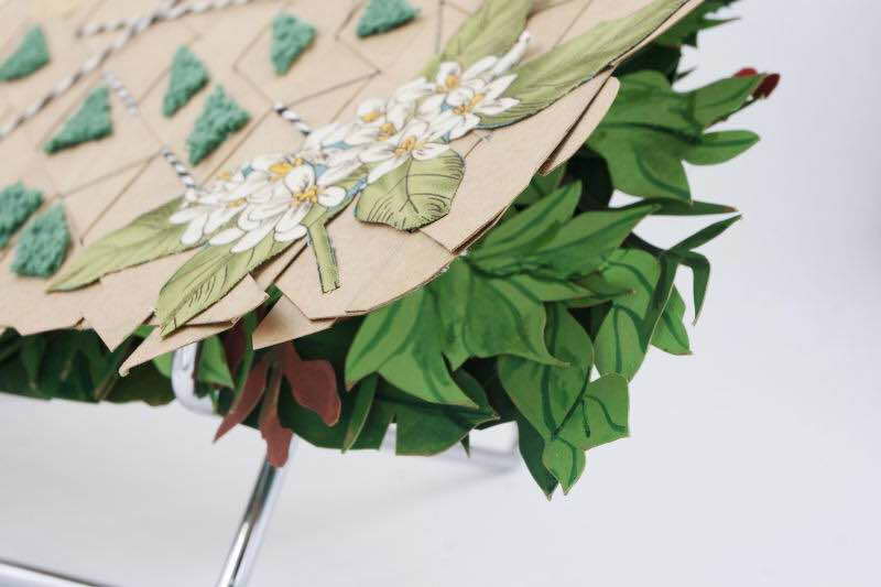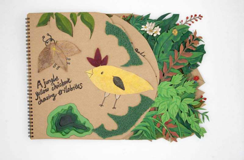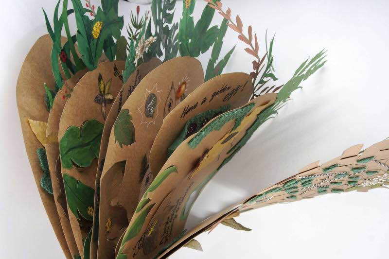 作品每一页左下角渐窄且渐深的洞,让作品不局限于一个平面的画册,而像是一个具有空间感的建筑。翻开封面,册子中每一页的树枝和树叶都不相同,颜色都由绿色的同系色构成,层层叠叠堆积在一起,显得更加葱葱郁郁。作品中还有许多可以翻折的树叶,使作品更有立体感。