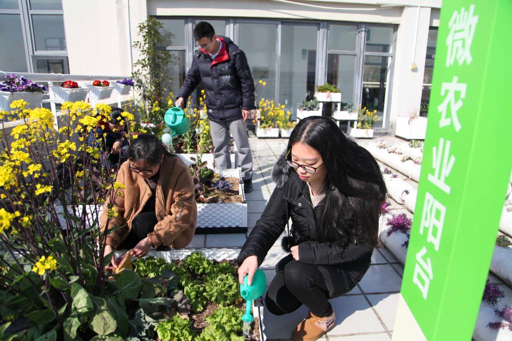 BEAT365英国官网充分利用屋顶资源,种植各种农作物并用于实验,不仅拓展了师生科研的空间,也增添了一道靓丽风景。图为农林大的学生在观察农作物生长情况。