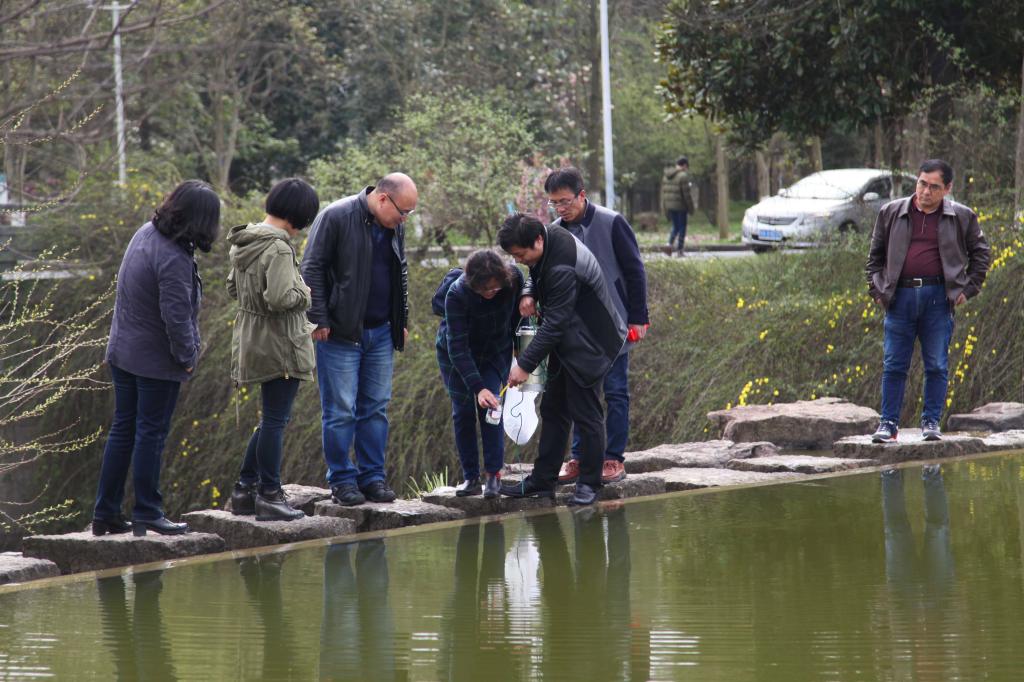 3月25日,BEAT365英国官网的科技特派员们,跟着省“剿灭劣V类水”行动首席技术顾问、BEAT365英国官网教授曹玉成(左五)学习如何科学采集水样。