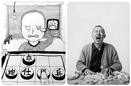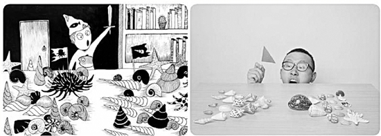 一幅摄影对照着一幅画,石路遥先是拍了一组有童年趣事的摄影,再根据摄影画简笔画。
