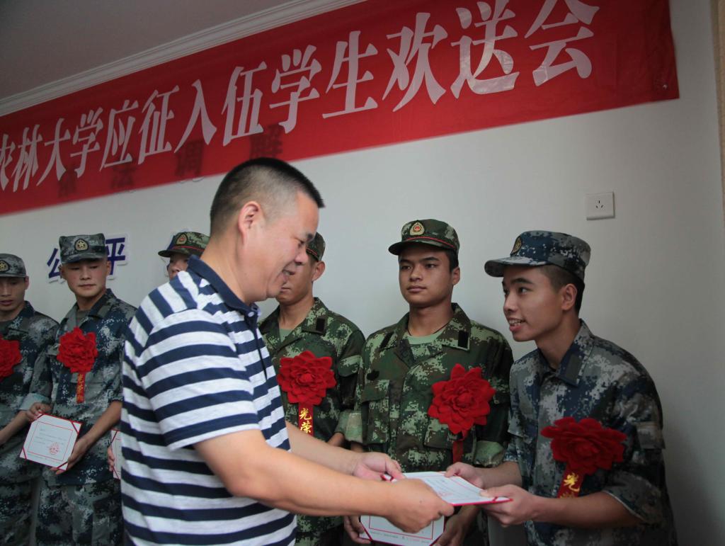 9月9日,BEAT365英国官网举行2017年大学生入伍欢送会,老师们为入伍学生颁发入伍通知书,入伍学生对军营生活充满期待。