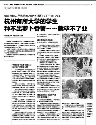 很多现代人四体不勤五谷不分,尤其是高校里的大学生,分不清水稻小麦的人大有人在。但是,杭州有所大学的学生,到田里种菜是必修课。从大一开始就要下地干活,种不出萝卜番薯,就拿不到学分毕不了业。