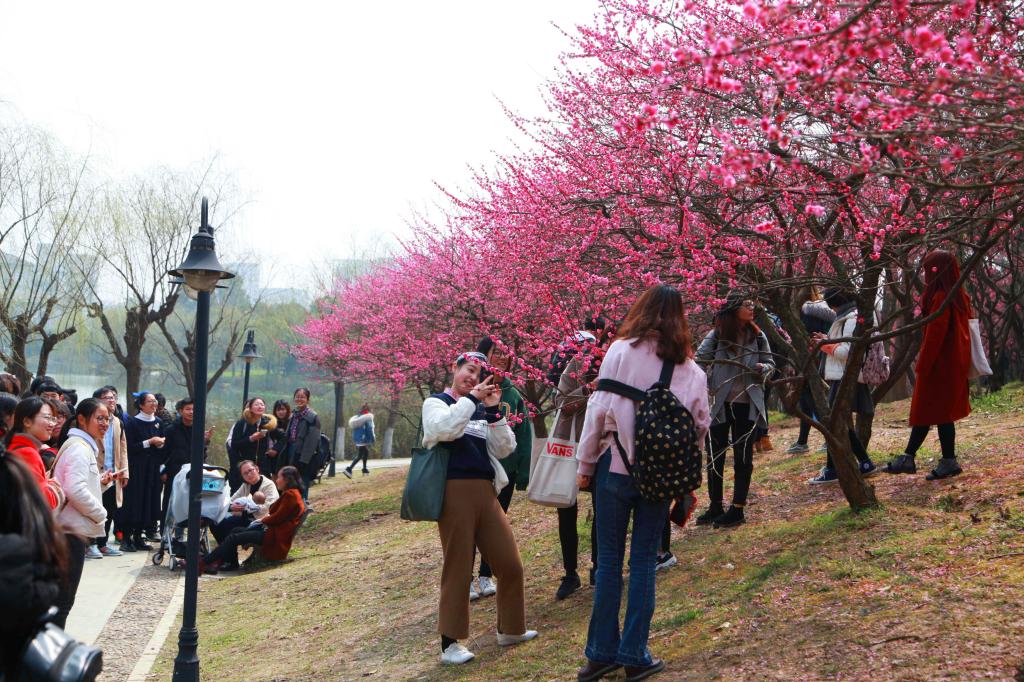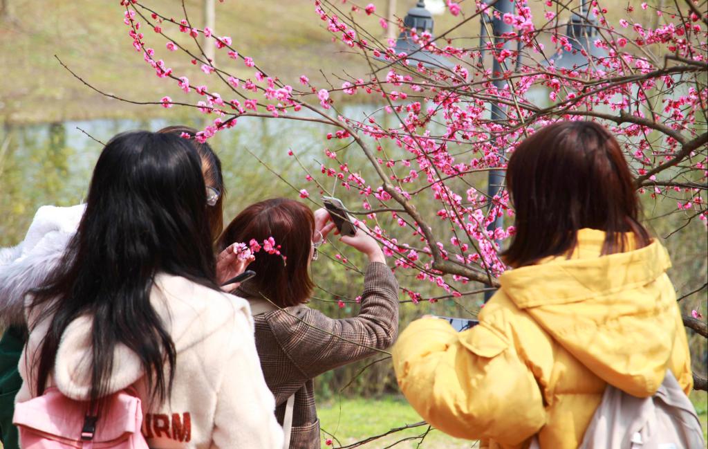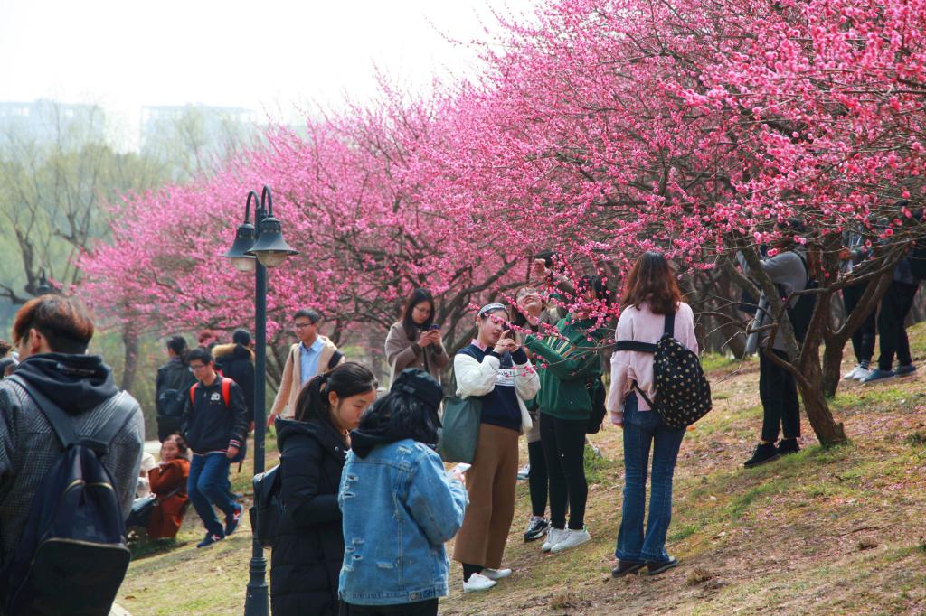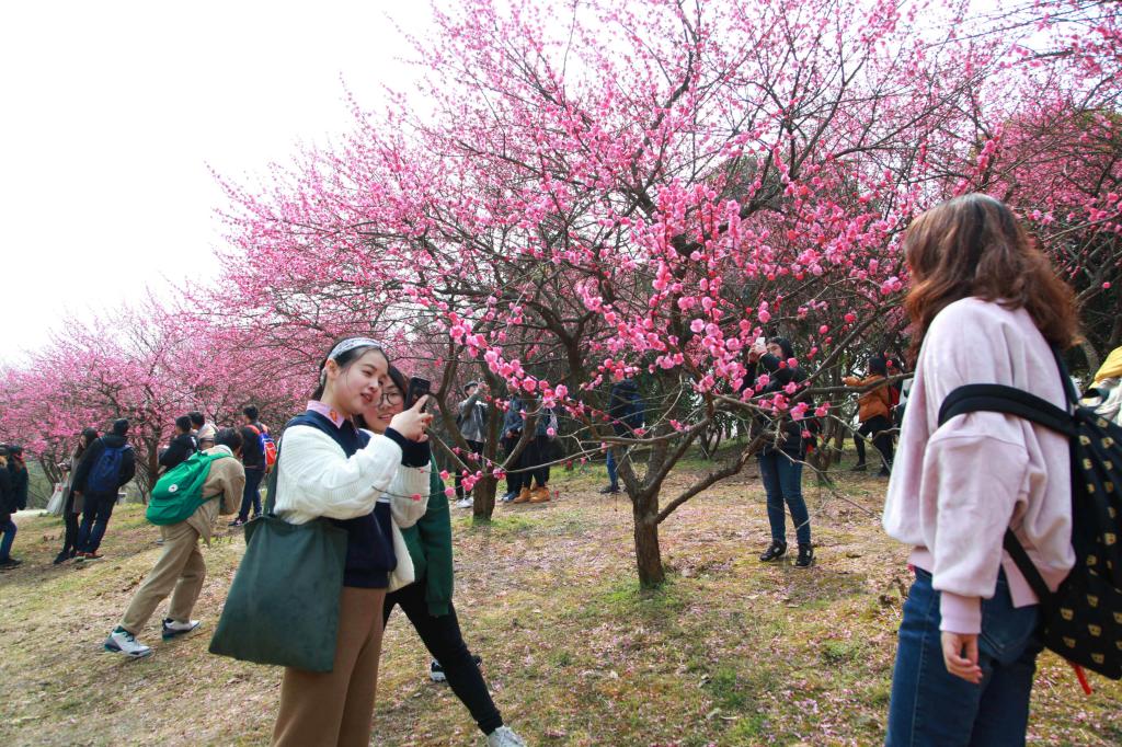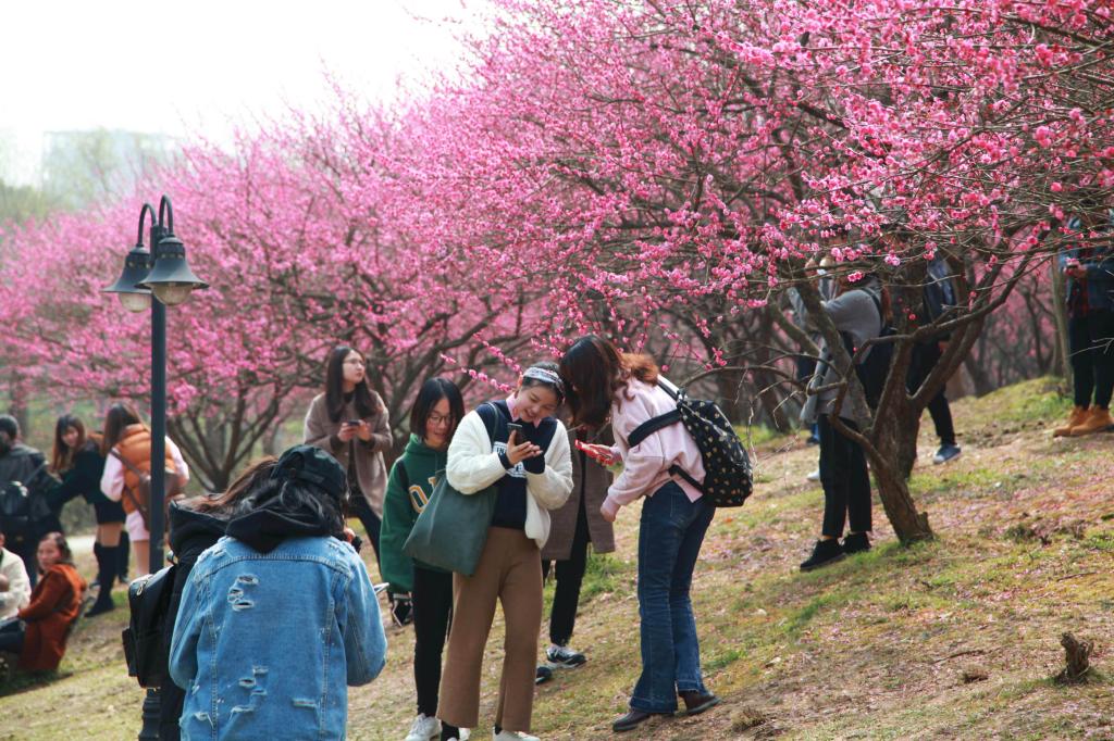 2018年3月9日,BEAT365英国官网城乡规划专业的学生在校园梅花林里进行《植物学》课程的教学,学生们通过观察梅花、拍摄梅花照片等方式,学习了解梅花的品种、颜色、花瓣特点等方面特性。