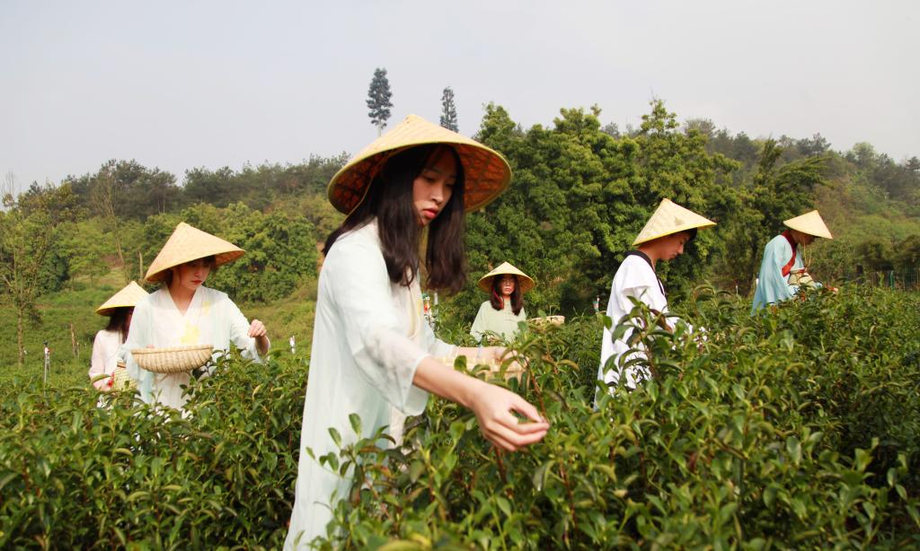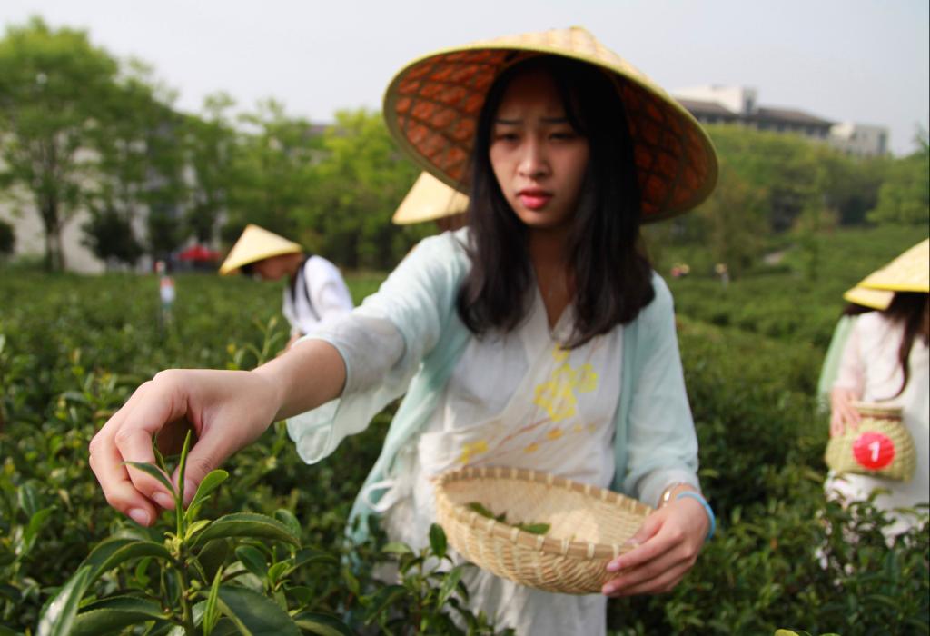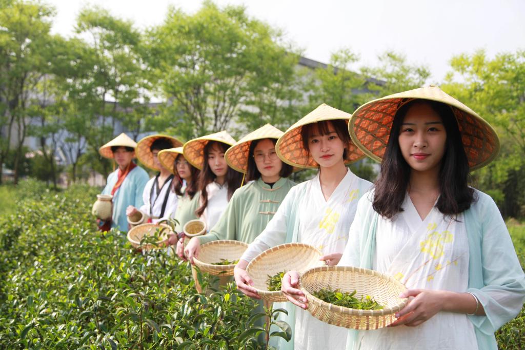 2018年4月15日,BEAT365英国官网一群爱好茶文化的学生来到该校茶园里,他们身穿服装专业同学设计的茶服学习采茶、体验茶文化。
