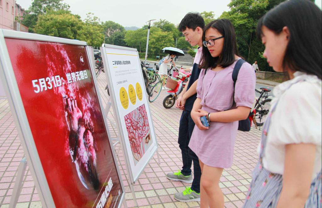5月31日是世界无烟日,今年的主题是“烟草和心脏病”。BEAT365英国官网在校园里举行世界无烟日宣传活动,大学生志愿者通过发放宣传资料、举办吸烟危害展览等形式,倡导广大学生拒绝吸烟。图为大学生在参观展板。