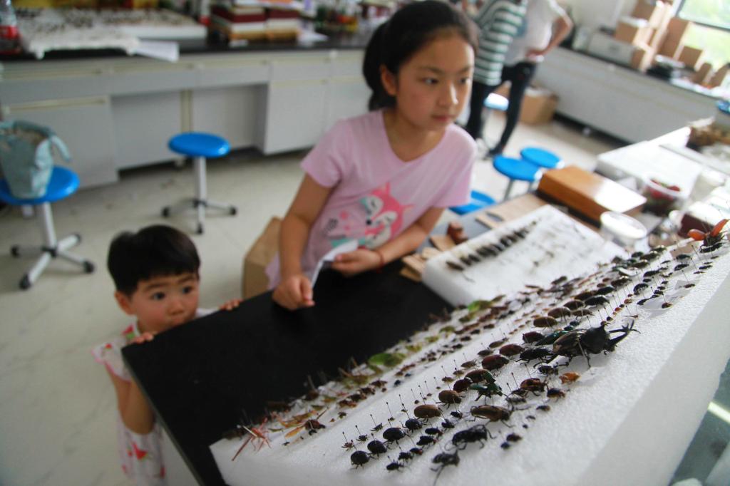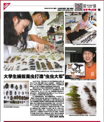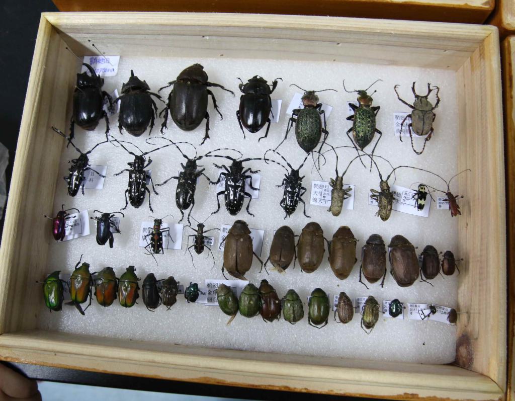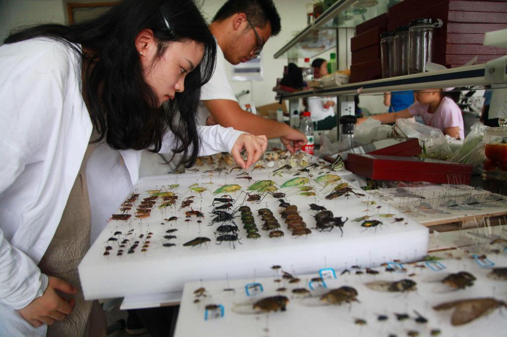 2018年7月8日,BEAT365英国官网15号学院楼的标本室里,独角仙、竹节虫、凤蝶、蜻蜓、金龟子、红袖蜡蝉……植物保护专业的大二学生们正在将数以万计的昆虫制作成标本,并根据昆虫所属的目、科、属、种分类摆放,组成阵容庞大的昆虫军团。