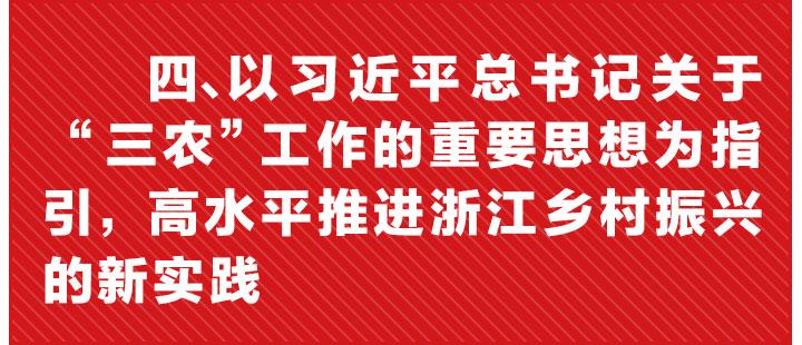 4.增创乡村振兴发展新优势,推动新时代浙江“三农”实现新飞跃。沿着习近平同志为浙江“三农”发展指引的道路,全面实施乡村振兴战略,在实践中不断探索创新、大胆改革,使生态宜居、特色乡村、人文乡村、善治乡村、智慧乡村、共富乡村成为浙江农村的普遍特征,推动浙江“三农”发展在新的起点上实现新的飞跃。着力展现浙江高效生态现代农业的新风采,夯实农业基础地位,使农业绿色化、优质化、品牌化、多功能化、产业融合化发展特征鲜明,新经营主体、新经营模式、新经营业态活力充分涌现,大力发展农村电子商务,不断拓展养生养老、运动健康等新业态,做优做精农家乐、民宿等新产业,鼓励支持资本人才流向农业农村,让农业真正成为有奔头的产业。着力展现新时代浙江新农村宜居宜业宜游的美丽乡村新风情,认真落实“大花园”建设行动纲要,扎实推进万村景区化建设,巩固扩大治水成果,推进生活垃圾分类处理,全面推进村庄规划、村庄设计和农房设计,建设一批具有乡土气息、江南韵味的浙派民居,使美丽乡村既成为农民美好生活的幸福家园,也成为城里人的休闲乐园、养生公园和养老胜地;全面塑造淳朴文明的良好乡风,用好传统文化在农村底蕴深厚、流传久远的优势,倡导现代文明理念和生活方式,让清风正气充盈每一个乡村,让家教家风滋润每一个家庭,让乡村文脉传承到下一代;全面加强乡村社会治理,以“最多跑一次”改革推进乡村治理集成化,完善自治、法治、德治“三治融合”治理体系,推进乡村治理制度创新,实现政府治理和社会调节、居民自治良性互动。着力展现新时代浙江新农民“爱农业、懂技术、会经营”的新风貌,使农民真正成为让人羡慕的体面职业;全面创造农民群众的富裕生活,千方百计增加农民收入,持续改善困难群众生活,积极壮大村集体经济,让农民群众过上更加幸福美好的日子。