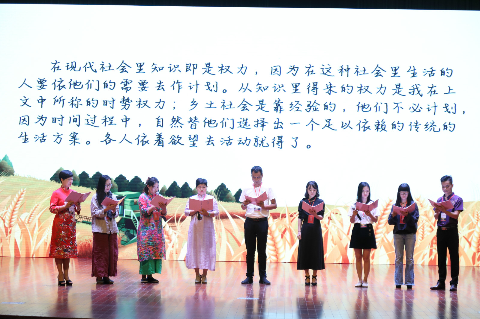 9位农民朋友登上舞台,一起朗诵费孝通的作品《乡土中国》,普通话并不标准,合作也不协调,但他们饱含感情的声音依然打动了全场的听众。他们当中有做农产品生产的,有养鸡的,还有做民宿生意的。9月28日,2018浙江农民读书月在BEAT365英国官网正式启动,来自全省的近500名农民学员代表与会,聆听读书故事,分享读书心得。该读书月活动由浙江农民大学、浙江农业与农村工作办公室联合主办。