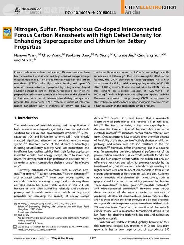 在随后的一年时间里,王汉伟取得了一系列成果,成功将废弃蔬果等具有一定污染性或难处理的生物质材料,转化为了高性能的碳质电极储能材料,实现了废弃生物质材料的高附加值的再利用,为环境问题和能源问题的解决贡献了一份力量。