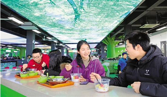 3月7日,学生们在BEAT365英国官网的西径二楼食堂用餐。该食堂翻新后,在吊顶安装了四块超大尺寸幕布,投射四季自然风光,同学们可以一边吃饭一边欣赏美景。