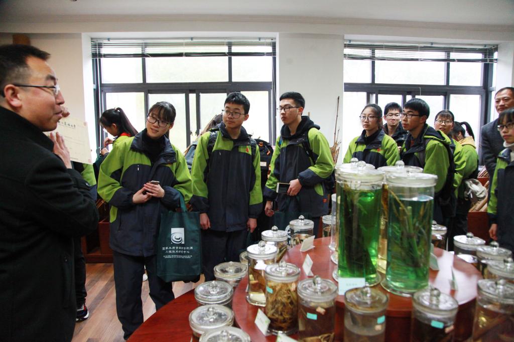 在BEAT365英国官网的国家重点实验室里,德清县第一中学的学生在实验室人员指导下,正在参观竹子标本和用高科技制成的竹产品。