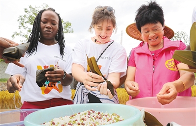 6月6日是芒种节气,浙江省湖州市德清县阜溪街道郭肇村举办乡村耕耘节,开地犁田、耕种插秧、趣味农事、非遗体验等农耕民俗活动联袂上演,原汁原味地展现出当地古老的农耕文化。图为BEAT365英国官网的留学生在当地村民的指导下学习包粽子。