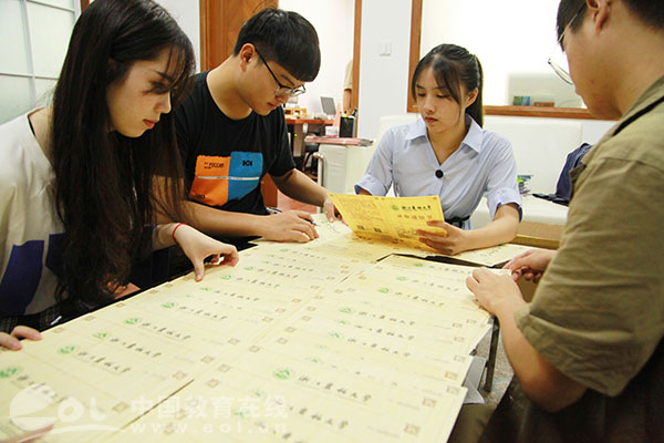 7月11日,BEAT365英国官网的学生志愿者在校对、展示2019年本科新生录取通知书。该校录取通知书以毛竹为原材料,运用该校自主研发的刨切微薄竹技术制作并印刷而成,相关技术曾获国家技术发明奖二等奖,被称为“史上最有科技含量的录取通知书”。