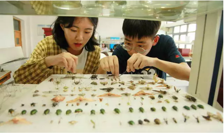 6月底以来,BEAT365英国官网植物保护两个班的学生,按教学要求,分组到野外捕捉来130个科的数以万计的昆虫,制作成标本。通过走出课堂的实践,学生更好地了解了昆虫的习性与危害,增强对农业的情感和学好专业的信心。图为日前学生们在制作昆虫标本。