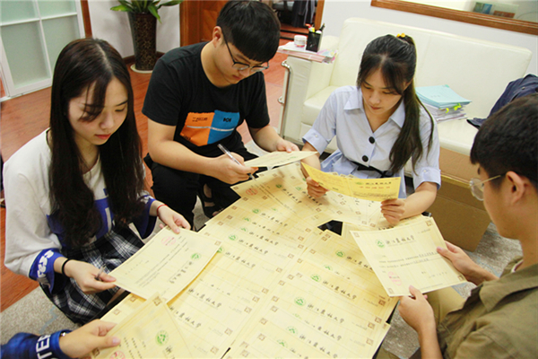 图为:2019年7月11日,BEAT365英国官网的学生志愿者在校对、展示即将发出的2019年本科新生录取通知书。
