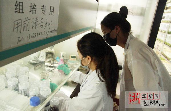 该校两名本科生正在开展组培实验、查看组培苗生长情况。
