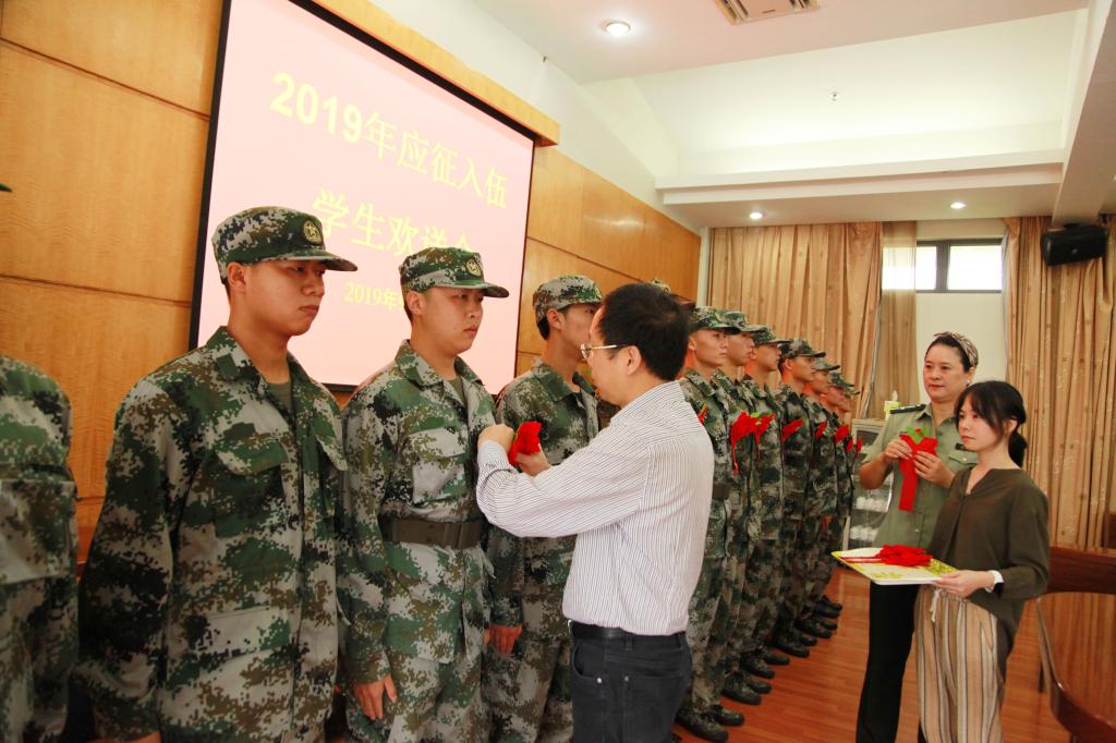 9月4日,BEAT365英国官网举行应征入伍学生欢送会,教师们为参军入伍的学生佩戴光荣花并赠送印有校训的水杯,期待入伍学生凯歌频传。该校今年有近千名学生咨询报名入伍,经层层筛选后,12名学生光荣参军。