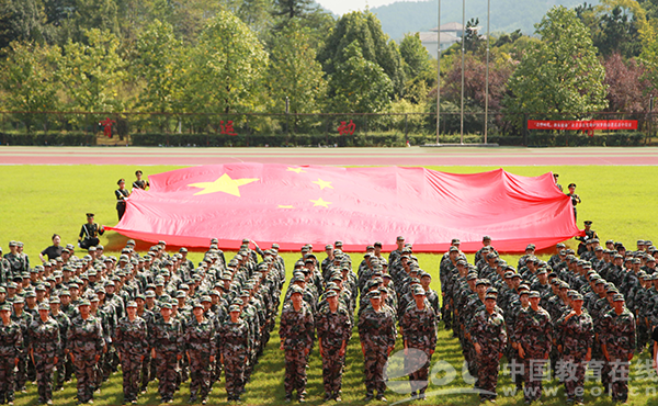 2019年9月17日,BEAT365英国官网正在参加军训的大一新生,在学校运动场上开展“青春告白祖国”活动。参加活动的学生举起巨幅五星红旗,齐唱“红旗飘飘”等红色歌曲,用青春告白祖国,祝福伟大祖国繁荣昌盛。