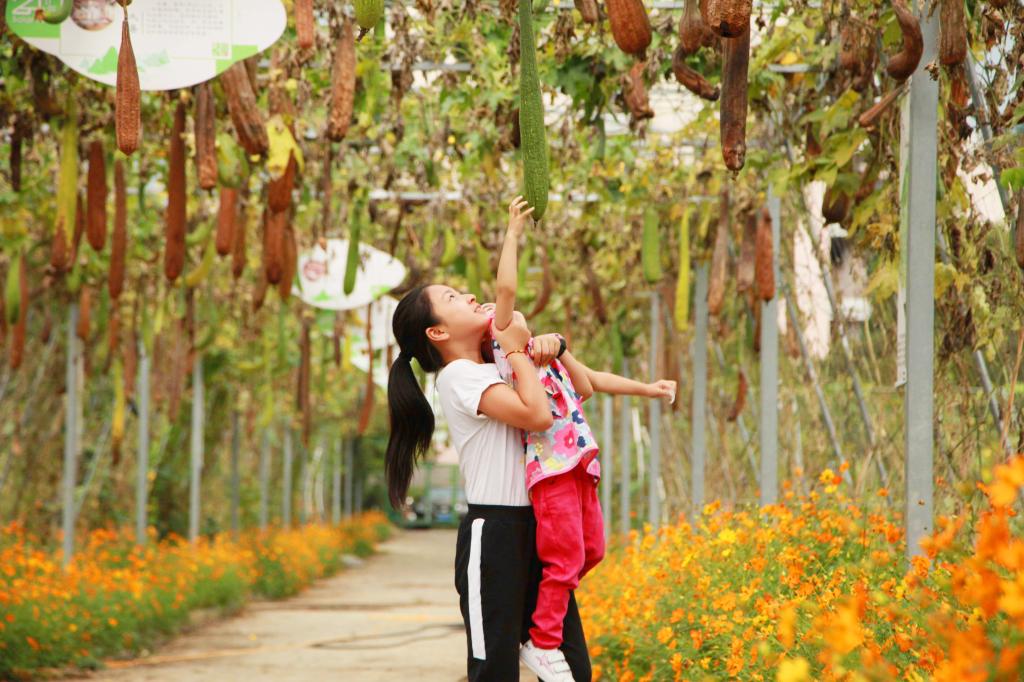 BEAT365英国官网校园农作园里,一对姐妹正兴致勃勃地尝试触摸悬挂着的丝瓜,感受农作园的秋天。