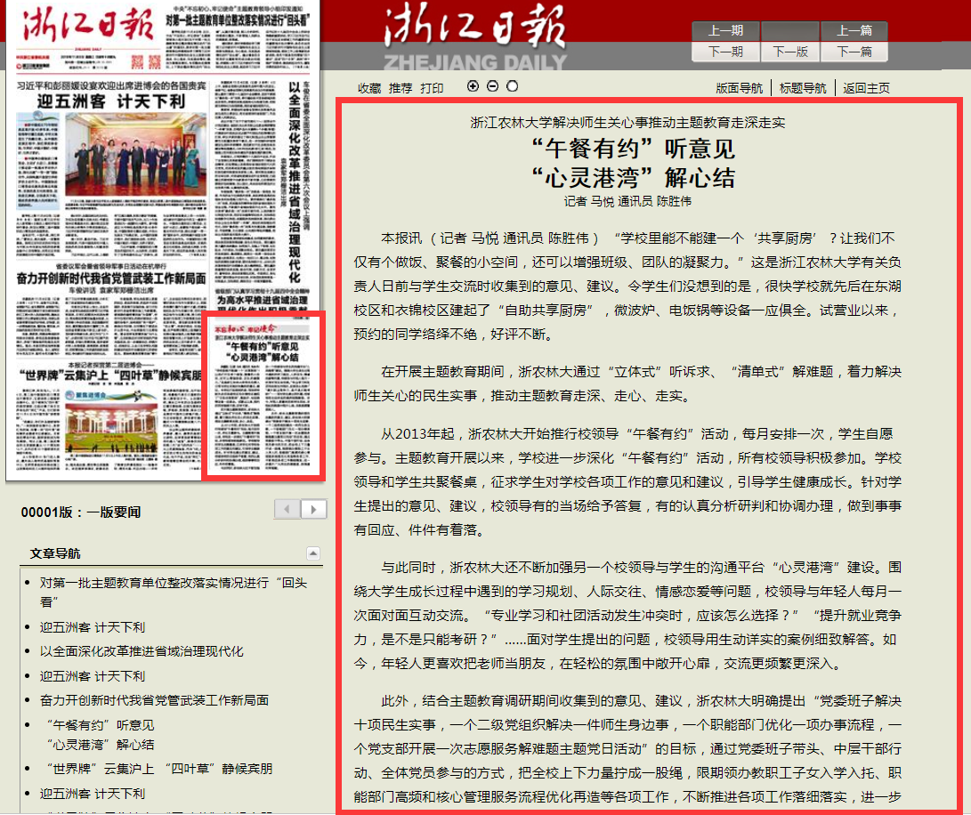 从2013年起,浙农林大开始推行校领导“午餐有约”活动,每月安排一次,学生自愿参与。主题教育开展以来,学校进一步深化“午餐有约”活动,所有校领导积极参加。学校领导和学生共聚餐桌,征求学生对学校各项工作的意见和建议,引导学生健康成长。针对学生提出的意见、建议,校领导有的当场给予答复,有的认真分析研判和协调办理,做到事事有回应、件件有着落。