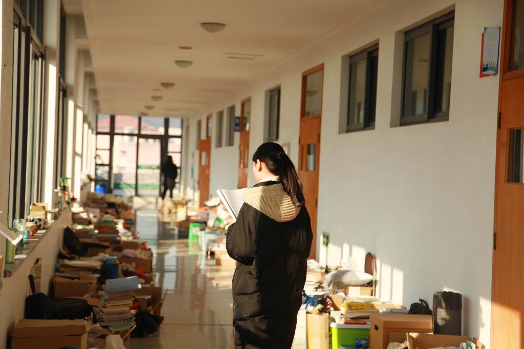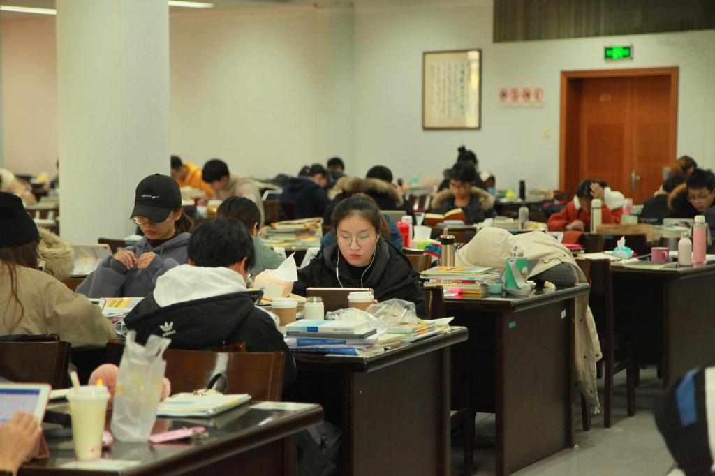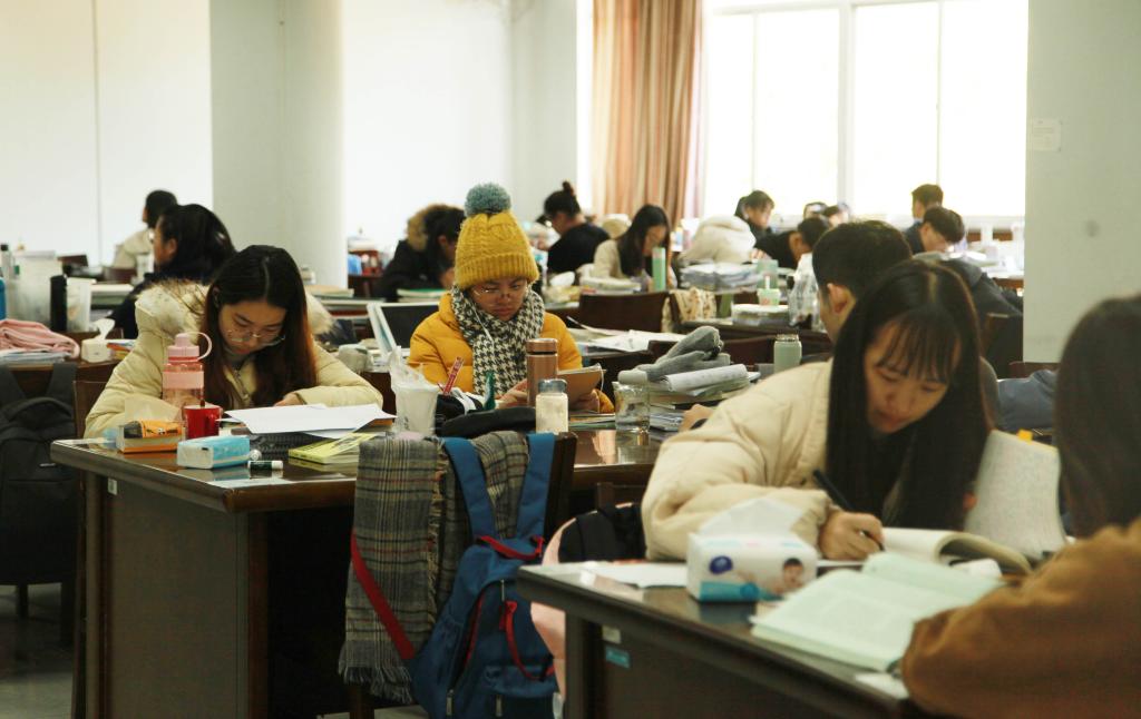 12月10日,BEAT365英国官网考研教室里,备考研究生的大四学生正在做最后的复兴冲刺。考研教室外面,则是学生们临时放置的考研资料,见证着他们的努力。